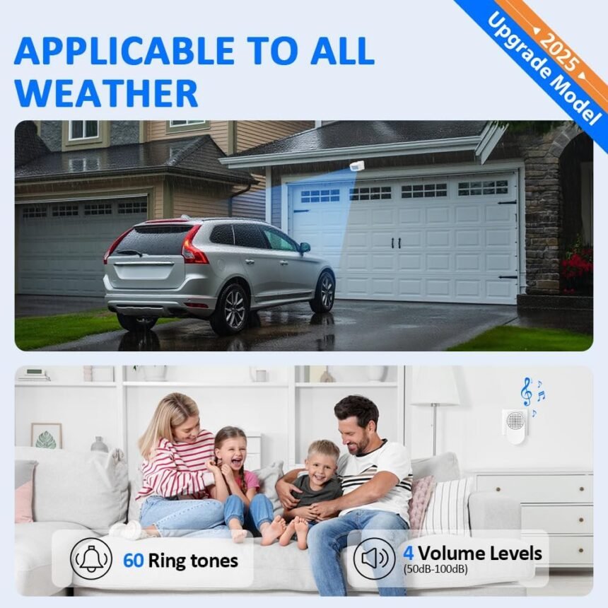 Weatherproof Design With an IP44 waterproof rating and anti-freeze materials, this driveway alarm system is durable in various weather conditions.