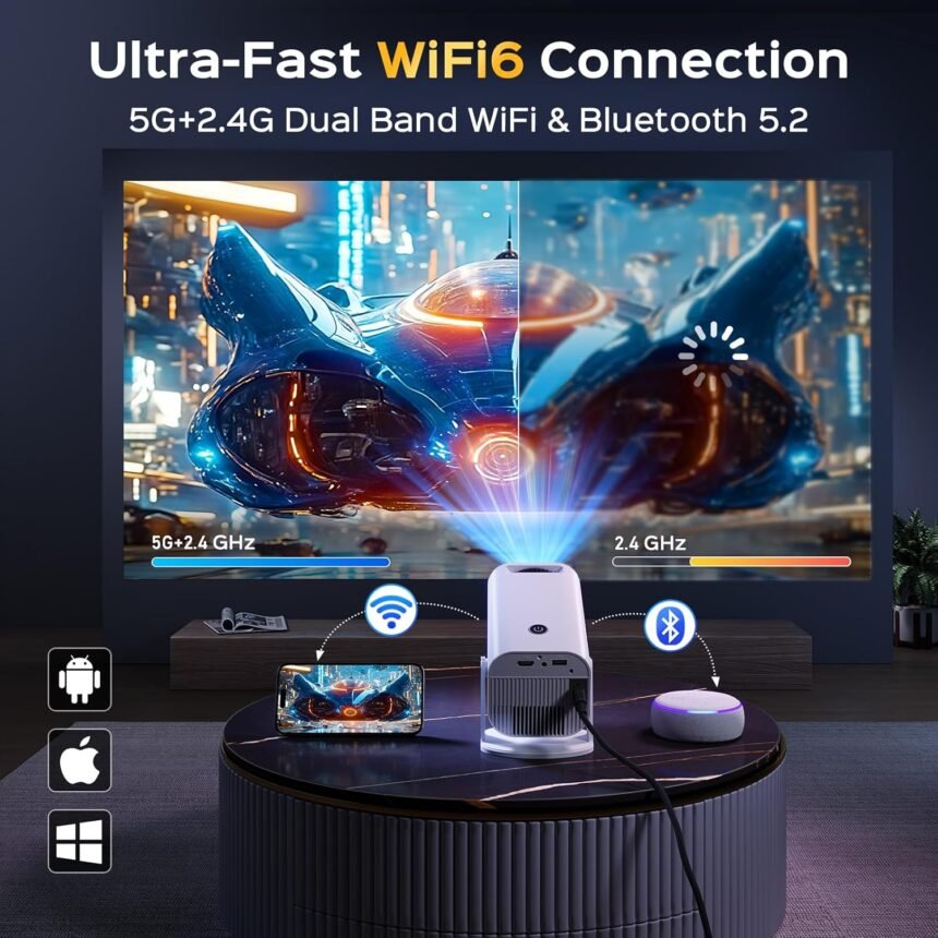 The projector boasts dual-band WiFi 6 connectivity, providing you with reduced latency and enhanced responsiveness. Its 180° rotatable design allows for flexible projection angles, making it perfect for projecting onto the ceiling or any surface without the need for fixed installation.