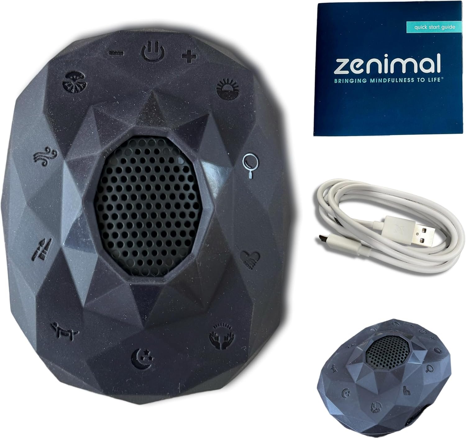 Our Zenimal Meditation and Sleep Machine comes with everything you need to start your mindfulness journey. With speaker and audio jack options, a rechargeable base unit, a food-grade removable silicone cover, and a micro USB charging cord, you’ll have all the tools necessary to create a tranquil space.